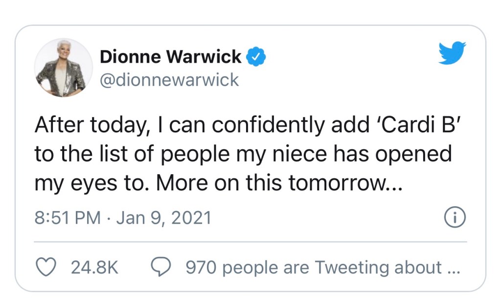 “After today, I can confidently add ‘Cardi B’ to the list of people my niece has opened my eyes to. More on this tomorrow,” the legendary singer promised Saturday night (Jan. 9) on Twitter, where she’s been known to make a few memorable statements about other musicians. (SNL even did a sketch inspired by Warwick’s viral tweets.)
