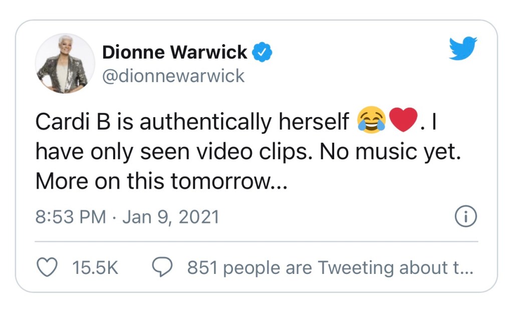 “Cardi B is authentically herself,” Warwick later explained, but added: “I have only seen video clips. No music yet.”
