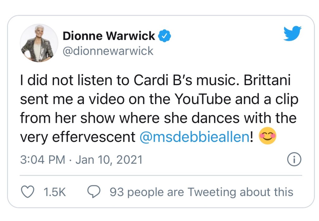 On Sunday, Warwick gave some context for her previous tweets: “I did not listen to Cardi B’s music. Brittani sent me a video on the YouTube and a clip from her show where she dances with the very effervescent @msdebbieallen!”