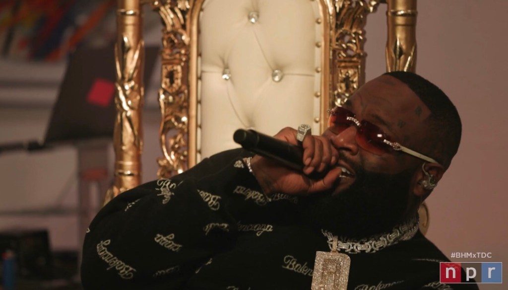 This Tiny Desk marks just the second time Ross has performed with a live band. On “Super High,” from his Teflon Don album, drummer Rashid Williams and bassist Thaddaeus Tribbett lay down the foundation for Ross’ smooth cadence and signature nonchalance. Background singer and Ne-Yo protege Troy Tyler projects the lead vocal lines originally sung by his mentor.