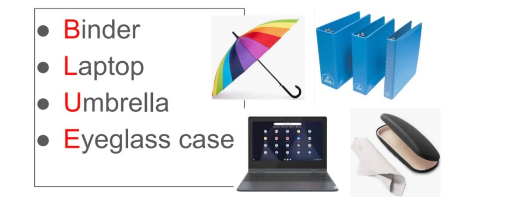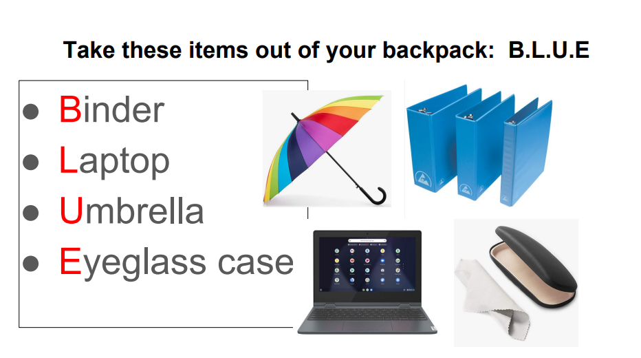The school has implemented a system when arriving at school called B.L.U.E. The Students should remove these items from their backpacks.